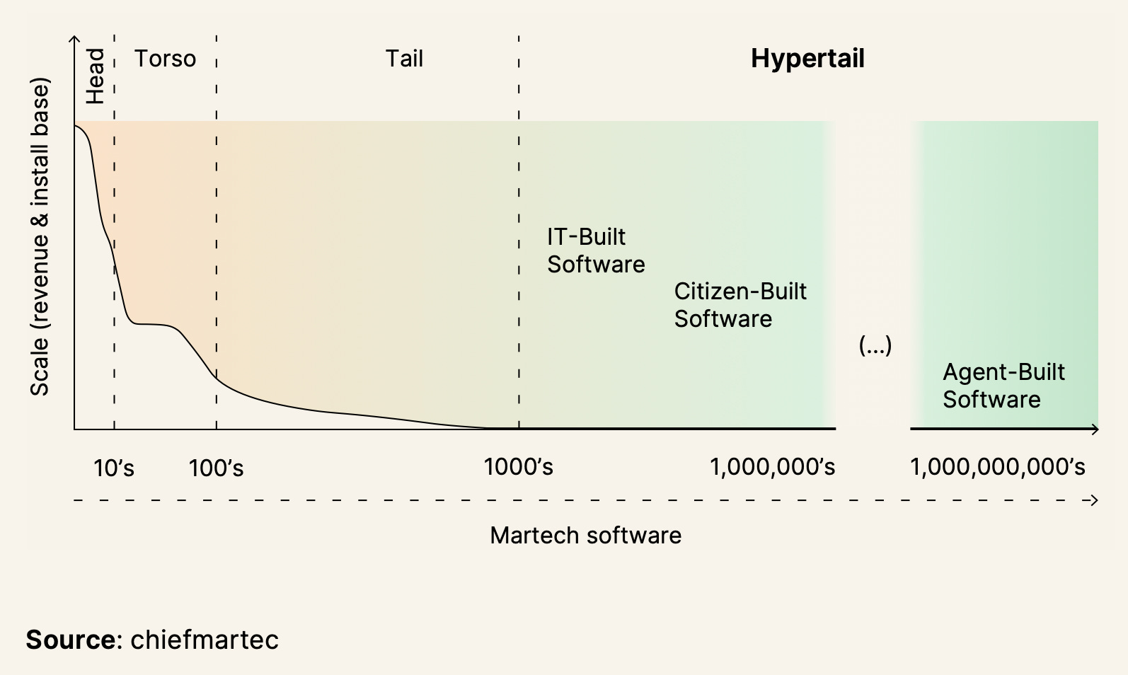 The rise of agentic platforms and AI native businesses seems like a continuation of the good old no-code platform trend that has been on the rise for at least the last 10 years. Will there be a new cycle and generation of such platforms powered by AI agents? If so, “beyond the millions of human-built no-code apps, there will be billions of AI agent dynamic programs”.
