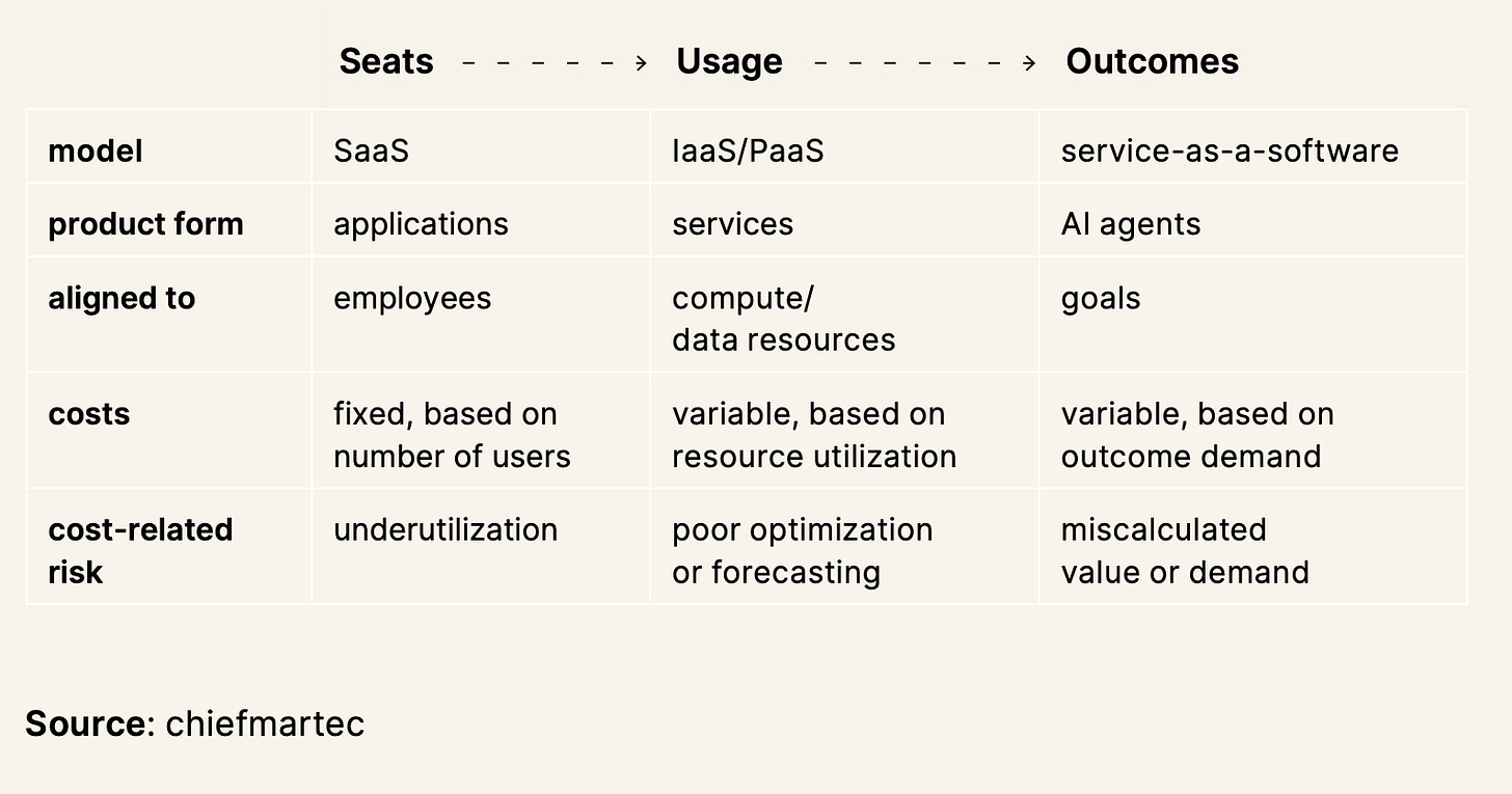 As for the pricing models, a clear trend towards outcome-based pricing is already visible and highlighted in Sequoia essay and ChiefMarTech 2025 report. A real-life example is how Sierra.ai challenges the customer service platform competitors by charging not per seat but by the number of service cases being closed. Lean and mean!