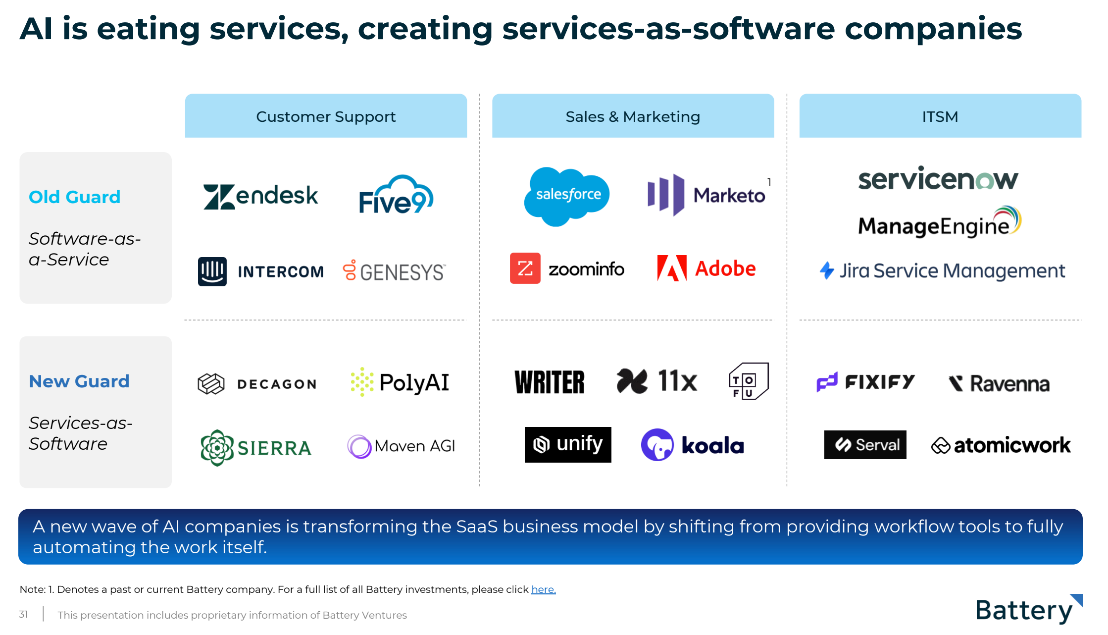 Service as a Software is gaining momentum. Traditional platform, service, and application businesses might soon have difficulty winning clients over AI-native ones. Battery and MenlvoVC agree that those who still think in conventional concepts about their business model must be on the lookout for disruption.